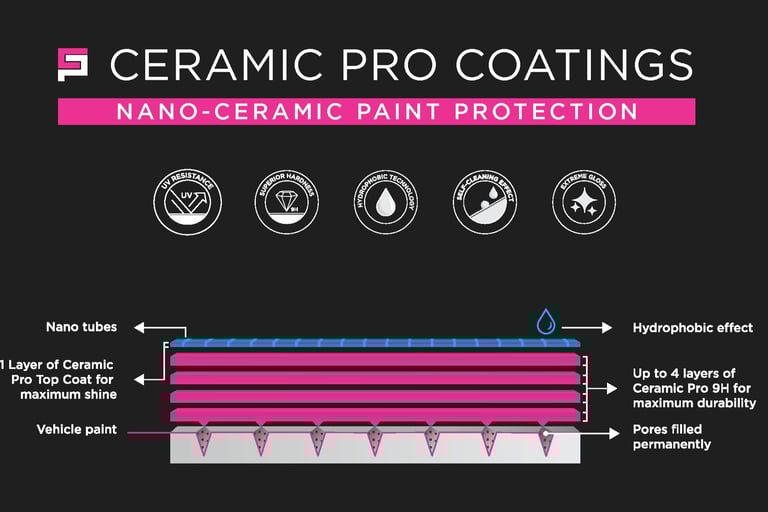 Our two-year ceramic coating offers a single layer of Top Coat protection, providing a durable shield against UV rays and environmental contaminants. It's ideal for those looking for long-term paint protection with low maintenance. While not as thick as multi-layer coatings, it delivers excellent gloss and hydrophobic properties at a competitive price.